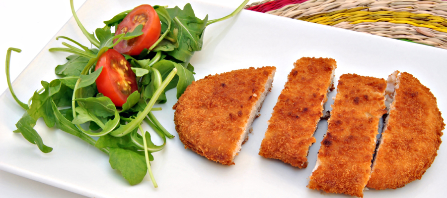 DISOLVER 0.750 KILOS DE "BATTER NATURAL 267" EN 3 LITROS DE AGUA FRÍA Y BATIR ENÉRGICAMENTE HASTA DISOLVER POR COMPLETO. PASAR LAS SUPREMAS REBOZADAS DE 1° PASADA POR LA SOLUCIÓN ESCURRIENDO EL EXEDENTE DE BATTER Y EMPANAR.